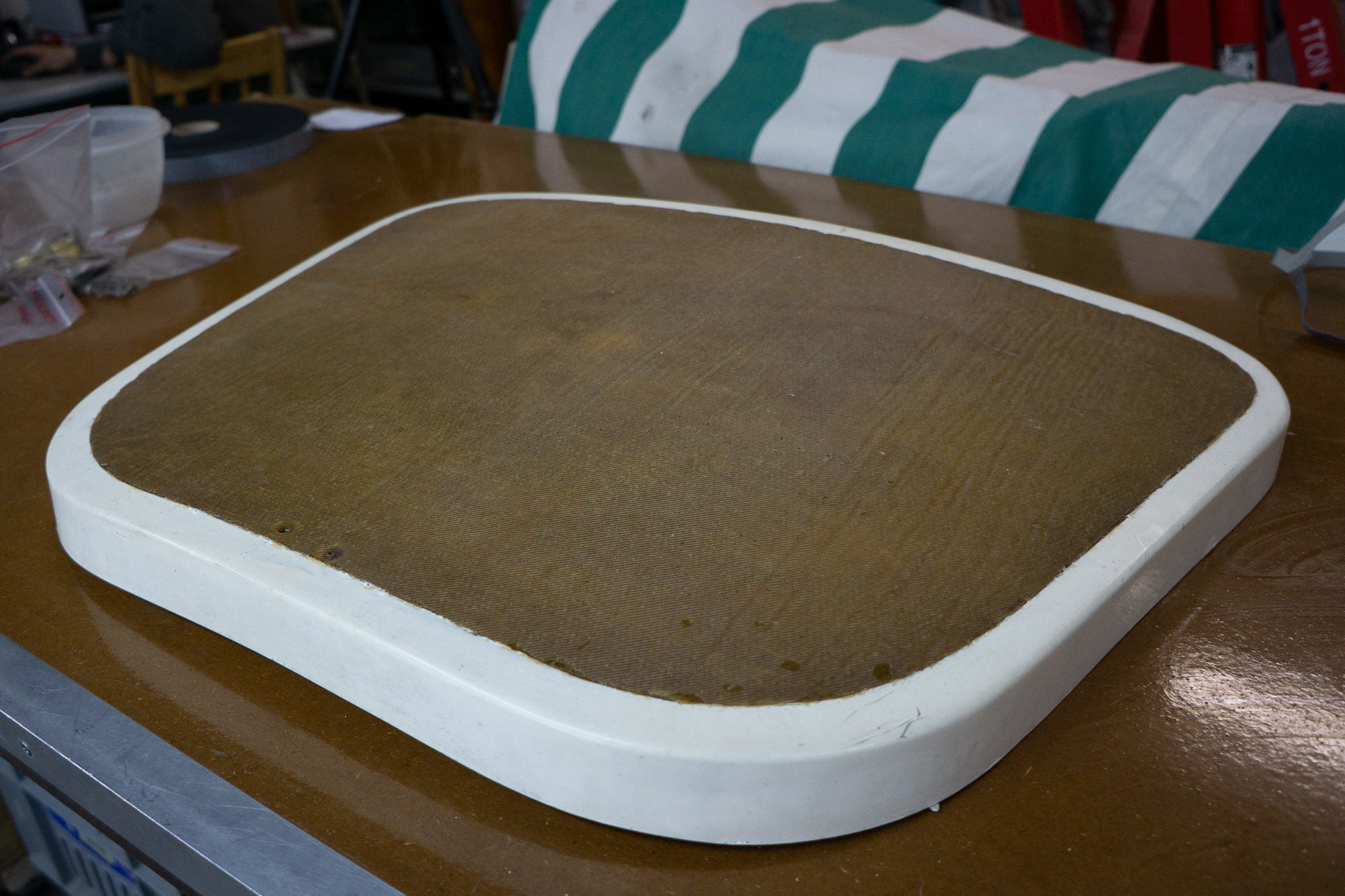 Auf der Oberseite möchte ich keine weiteren Matten aufbringen. Die Stabilität ist durch die Verstärkung auf der Unterseite gegeben. Auf der Oberseite möchte ich hingegen das Laminat vor weiteren Schäden schützen. Hierfür bringe ich 3 Schichten Polyesterharz auf, unverdünnt und ohne Matten. Zwischen den einzelnen Durchgängen benutze ich jeweils Abreissgewebe. Eine der besten Erfindungen überhaupt. Es wird einfach aufs feuchte Laminat aufgebracht. Nach dem Aushärten kann man es in einem spitzen Winkel einfach abziehen. Das Abreissgewebe reduziert Unebenheiten und Luftbläschen. Es erspart mir ausserdem mühsames Anschleifen vor dem nächsten Anstrich und gibt mir ausserdem eine schöne rauhe Oberfläche am Ende! Ein guter Ersatz für die Wabenstruktur. So ist die Luke nicht rutschig, wenn man sich mal darauf stellt.