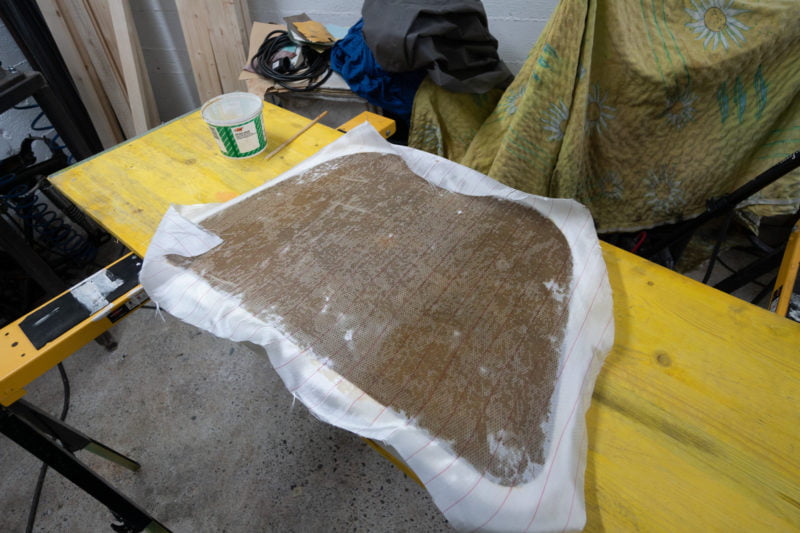 Ich habe dann die Unterseite der Luke mit 3 Lagen Glasfasermatte (2 Lagen 300g/qm für Stabilität und zum Schluss eine Lage 175g/qm für ein schöneres Finish) und Polyesterharz verstärkt. Die Glasfasermatte muss man nicht schneiden, man kann sie einfach „zurechtreissen“. Beim Arbeiten mit Harz ist die Vorbereitung wichtig! Nichts ist blöder, als mit harzgetränkten Handschuhen plötzlich zu merken, dass man noch eine weitere Glassmatte vorbereiten muss. Ich lege mir also immer alles schon parat – die Glasmatten also auch in der Reihenfolge, wie ich sie nachher aufbringen möchte.