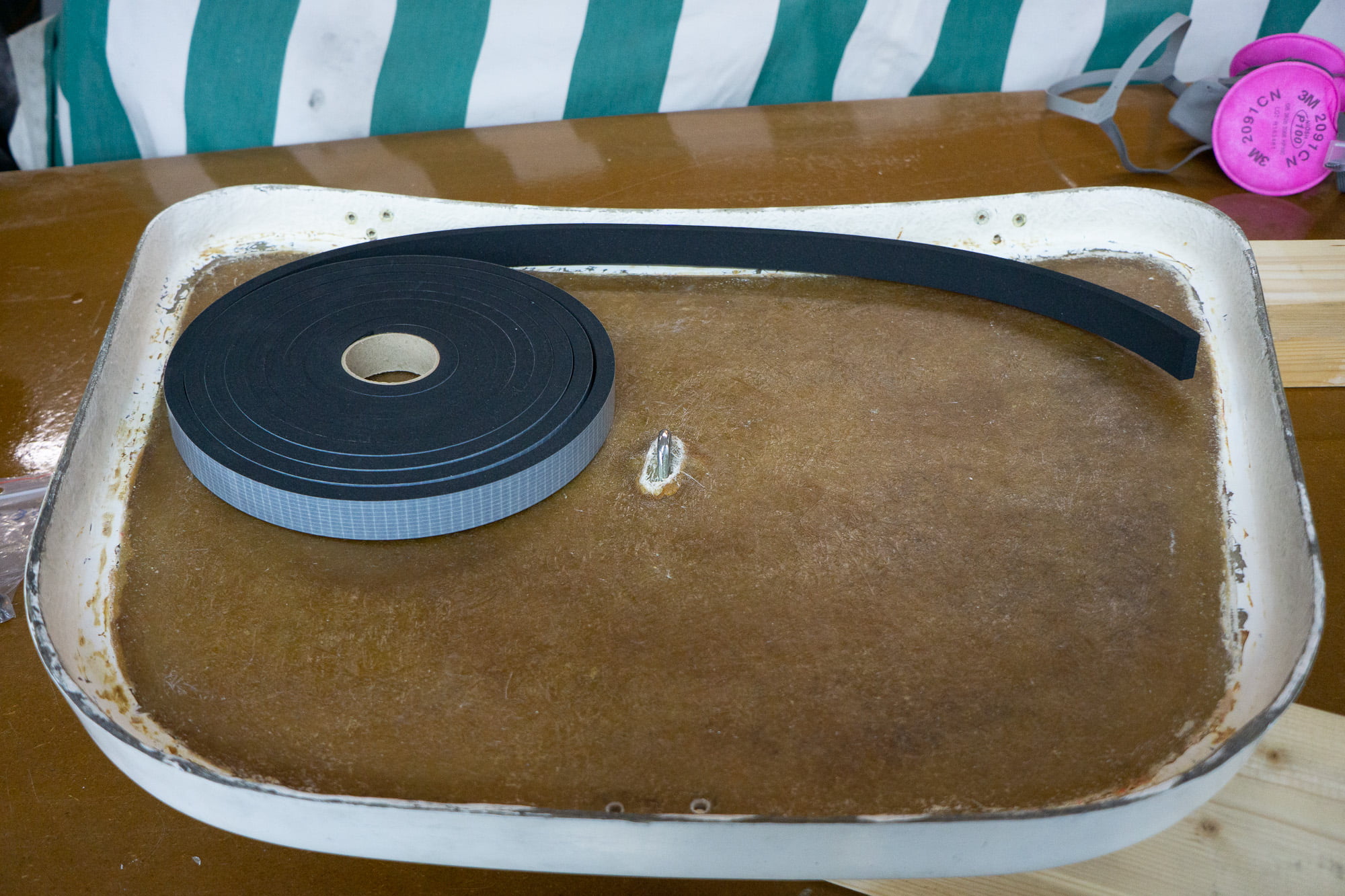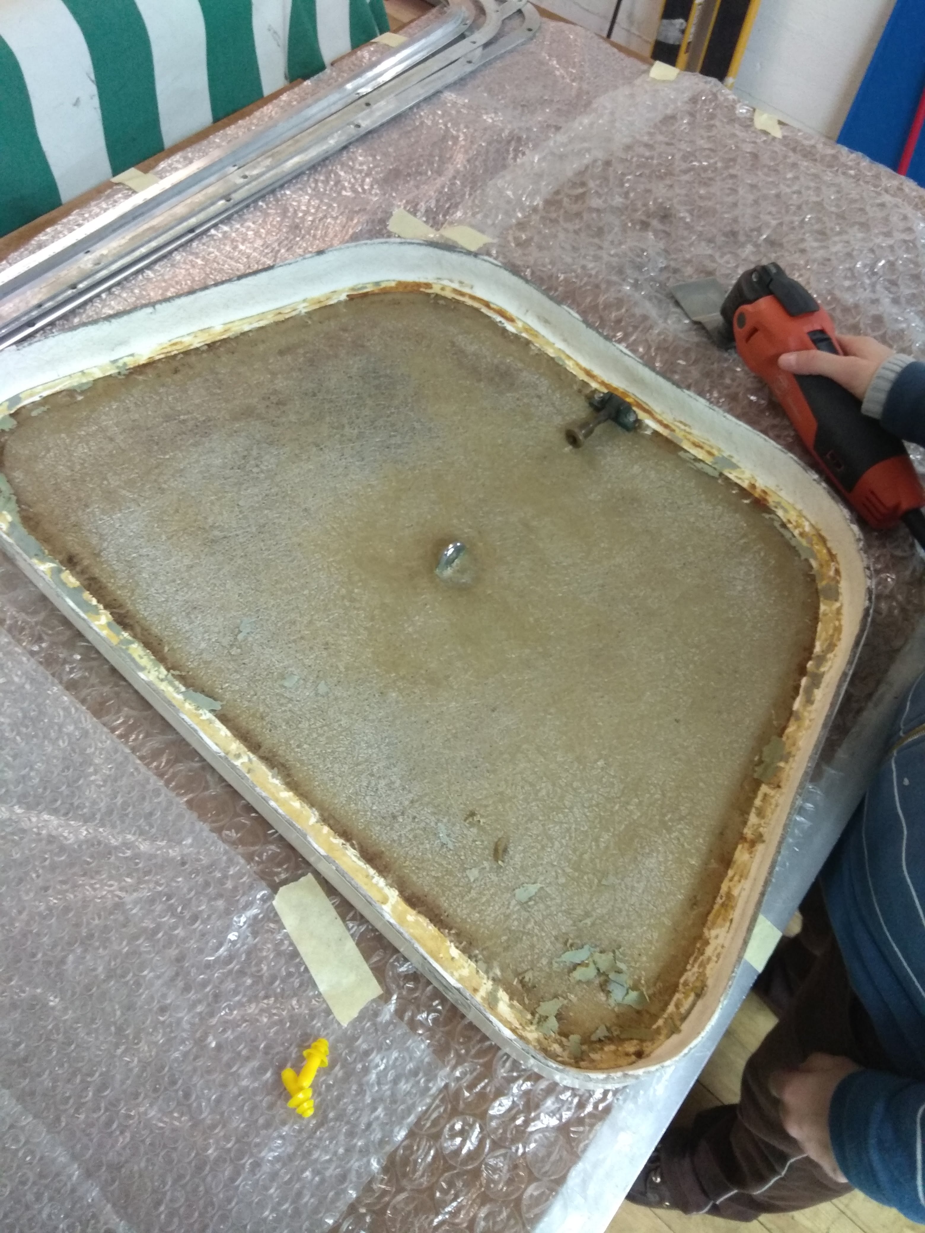 Als erstes habe ich die Luke abgebaut, alle Beschläge entfernt, und die Dichtung entfernt. Zuerst habe ich mich mit einem Teppichmesser daran gemacht, aber da ich ja bekanntlich kein geduldiger Mensch bin, bin ich schlussendlich auf den Schaber-Aufsatz des Fein Multimasters umgestiegen und die Sache war in 2 Minuten erledigt. Die Fein ist wirklich einfach das beste Werkzeug! Alle Klebereste habe ich mit Silikonentferner entfernt, und alles, was dann noch da war, hat eine Ladung Aceton zu spüren bekommen. Am liebsten benutze ich solche Mittelchen in Kombination mit Baumwollpads – die saugen schön Zeug auf, geben es aber auch wieder ab! Das geht viel besser als mit Papiertüchern oder dergleichen.