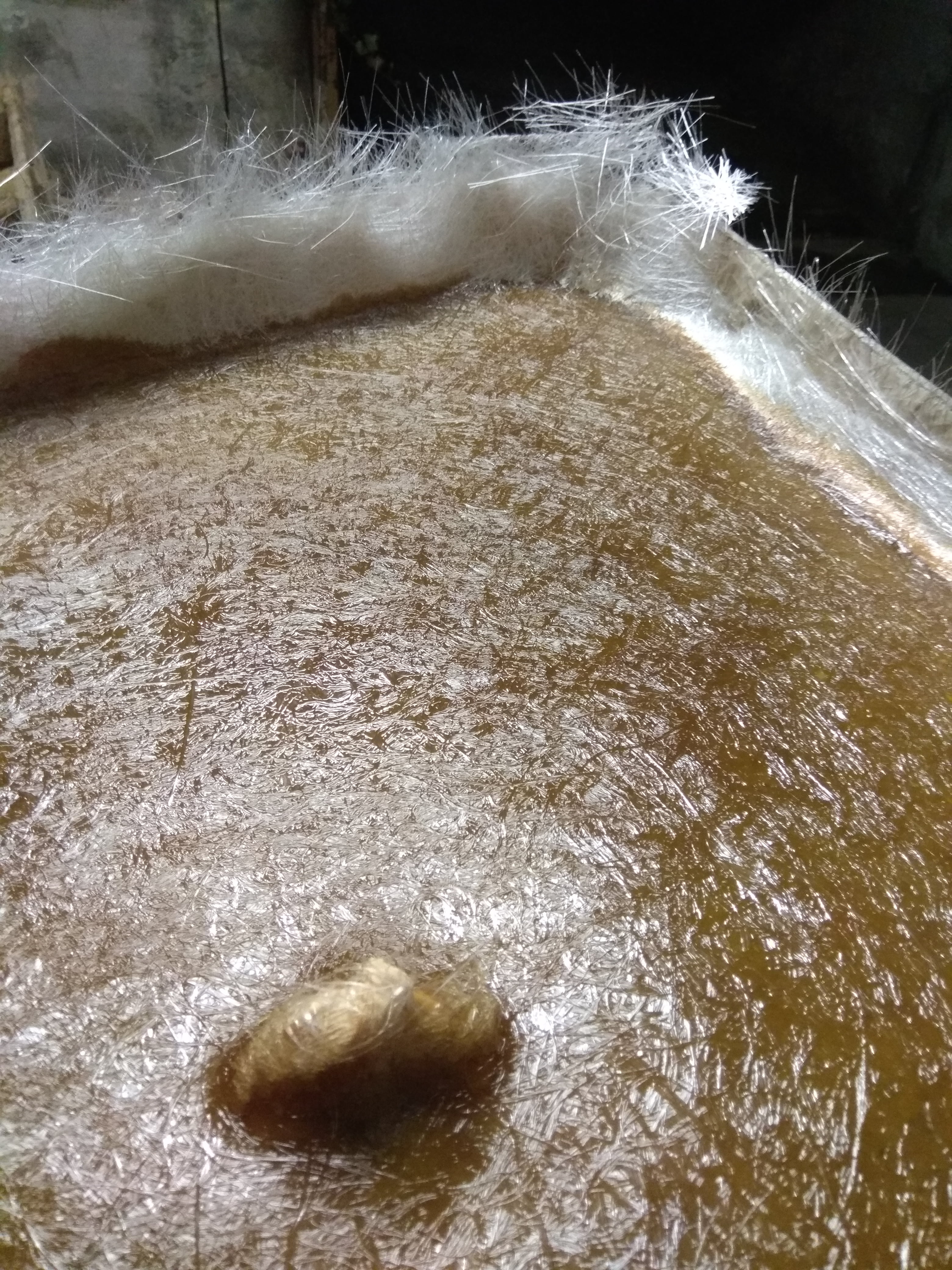 Ich habe dann die Unterseite der Luke mit 3 Lagen Glasfasermatte (2 Lagen 300g/qm für Stabilität und zum Schluss eine Lage 175g/qm für ein schöneres Finish) und Polyesterharz verstärkt. Die Glasfasermatte muss man nicht schneiden, man kann sie einfach „zurechtreissen“. Beim Arbeiten mit Harz ist die Vorbereitung wichtig! Nichts ist blöder, als mit harzgetränkten Handschuhen plötzlich zu merken, dass man noch eine weitere Glassmatte vorbereiten muss. Ich lege mir also immer alles schon parat – die Glasmatten also auch in der Reihenfolge, wie ich sie nachher aufbringen möchte.