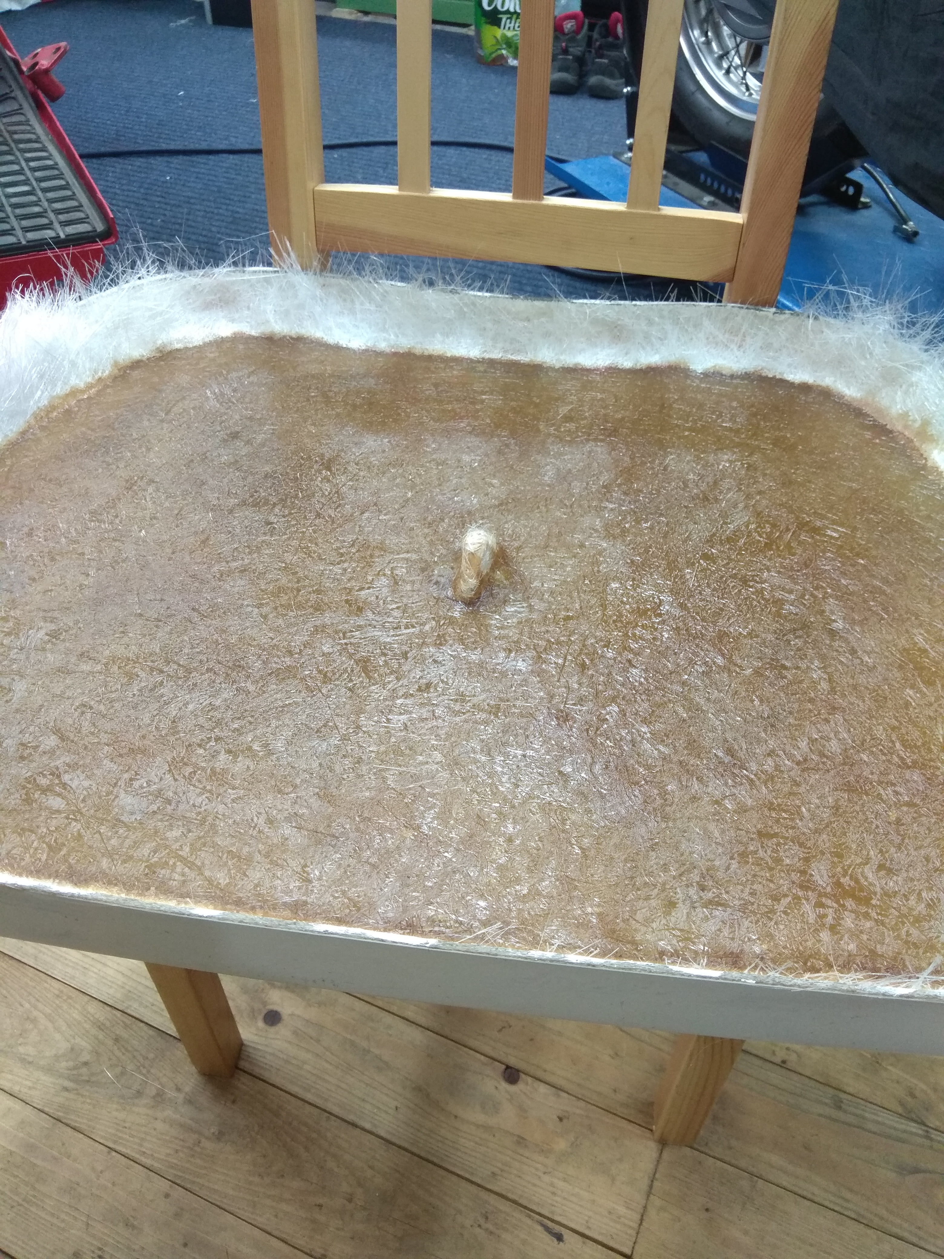 Als nächstes kann man Harz anmischen. Als Mischgefäss verwende ich alte Yoghurtbecher und Holzstäbchen. Man braucht auf jeden Fall eine genaue Waage (ich nenne sie Drogenwaage), denn man mischt nur 1 bis 2 Prozent MEKP-Härter bei. Falls einem zu viel reinrutscht, am besten mehr Harz beifügen, sonst wird die ganze Masse sehr schnell sehr warm (been there, done that)! Hierbei unbedingt Handschuhe und Chemiemaske tragen, das Zeug ist echt ungesund. Auftragen tue ich mit ultragünstigen Einmalpinseln. Ich trage eine erste Schicht Harz auf, danach kommt die erste Matte, dann wieder Harz, die zweite Matte, Harz und dann die letzte Matte. Die Matten können ruhig am Rand etwas überstehen, das kann man nach dem Härten des Harzes einfach wegschleifen. Zwischendurch immer mit dem Entlüftungsroller entlüften. Hierfür am besten von innen nach aussen langsam rollen und nicht wild hin und her, so bringt man nämlich noch viel mehr Blasen rein. So lange rollen, bis keine Blasen mehr enthalten sind.